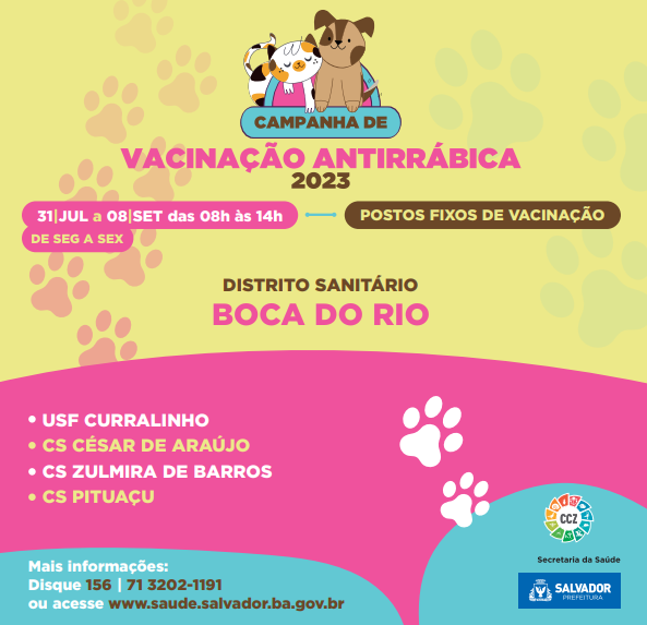 Quem é morador da região da Boca do Rio e deseja vacinar o seu animal, os postos de saúde USF Curralinho, CS César de Araujo, CS Zulmira de Barros e CS Pituaçu estão aplicando o imunizante. Porém, para verificar a relação completa das unidades, basta acessar o site da Secretaria Municipal de Saúde (SMS) (clique aqui para acessar), ligar para o Fala Salvador 156 ou para o telefone (71) 3611-7331.