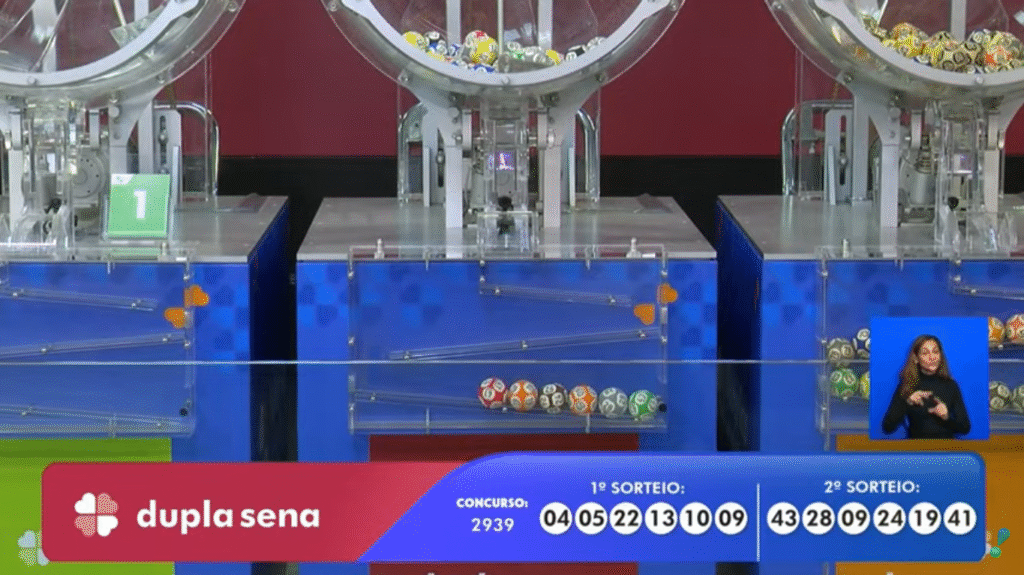 Os números sorteados na Dupla Sena 2939 foram: 1º Sorteio: 04, 05, 09, 10, 13, 22 2º Sorteio: 09, 19, 24, 28, 41, 43