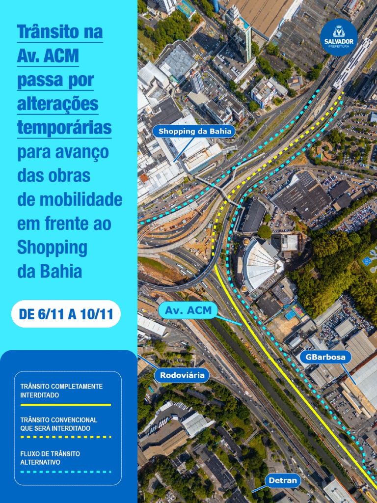 Ainda na noite de sexta, às 22h, a interdição será retomada na descida do viaduto do BRT em frente ao Shopping da Bahia, para a montagem de dois guindastes, de 500 e 450 toneladas. A liberação está prevista para as 5h do sábado (8), porém com três faixas da ACM permanecendo bloqueadas, devido à presença dos guindastes na pista.