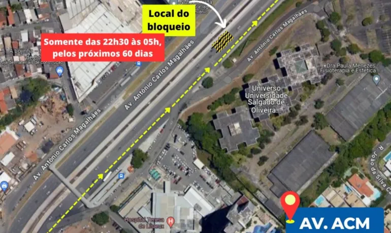 Um trecho da Avenida Antônio Carlos Magalhães, mais conhecida como ACM, será interditado provisoriamente a partir desta quinta-feira (2). Segundo informações da Superintendência de Trânsito de Salvador (Transalvador), o acesso ao viaduto que fica na altura do Hospital Teresa de Lisieux ficará bloqueado entre o fim da noite e a madrugada, das 22h30 às 05h do dia seguinte.